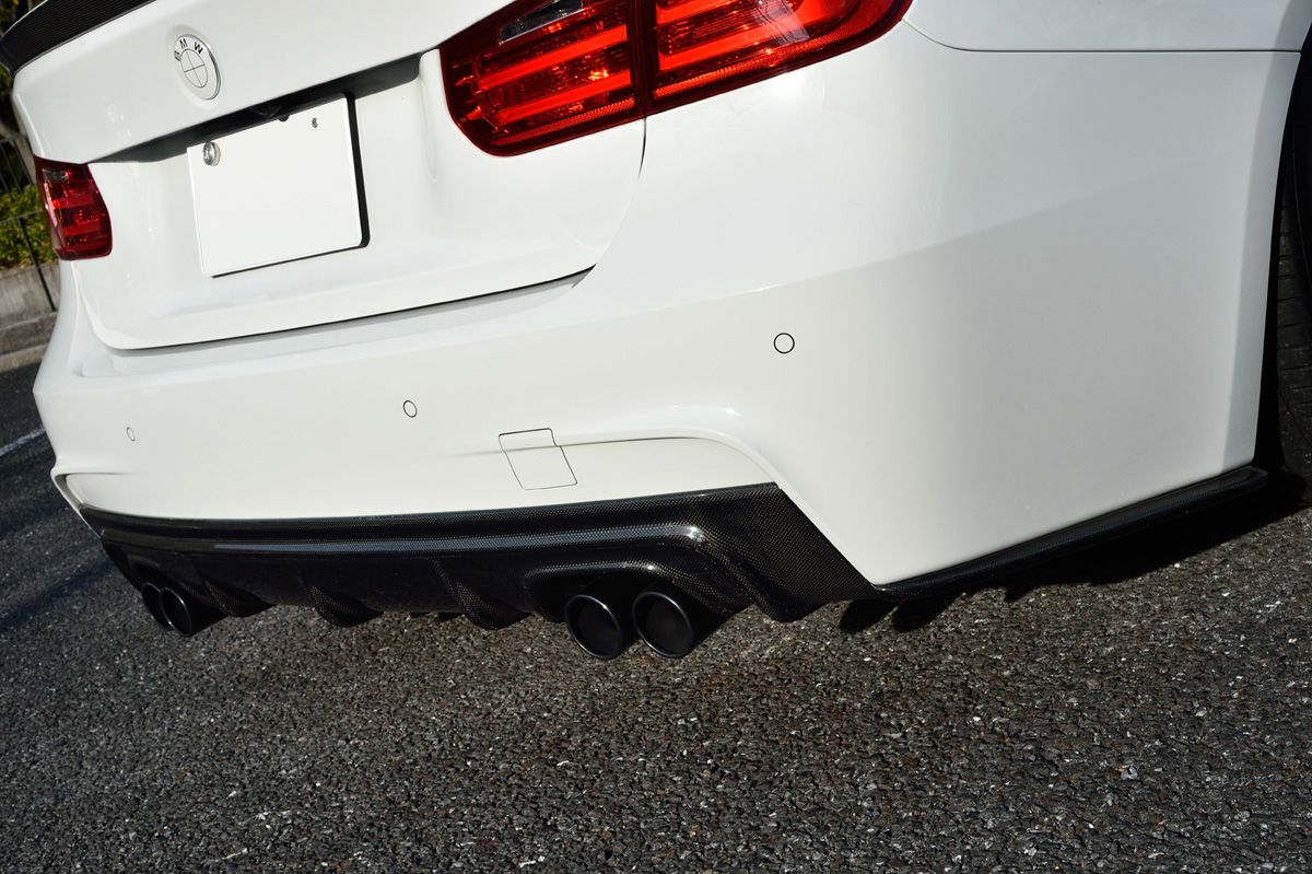 デュアル4テールマフラーに対応したリアディフューザー。スポーティーなデザインを付与すると共に、リアエンドのダウンフォースを整えます。 320i/328i/320d専用品となります。