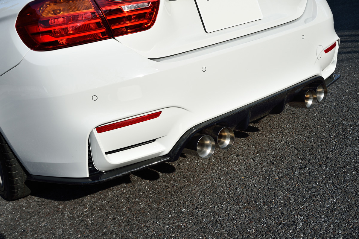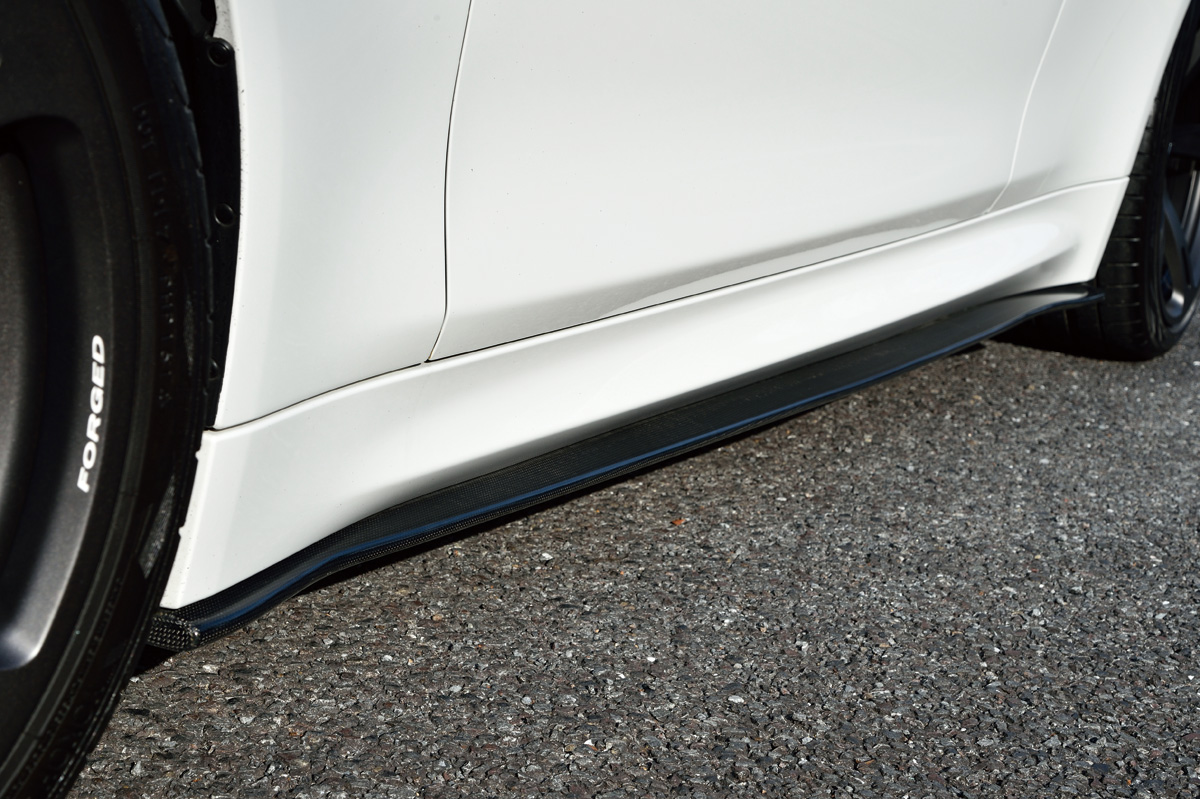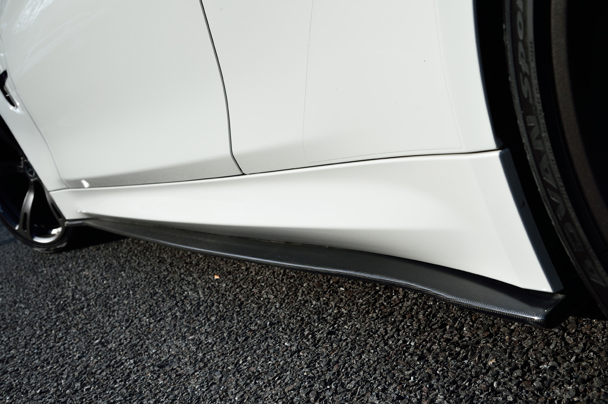 M4のサイド部の造形を拡張するデザインを採用したサイドスカート。フロントリップスポイラーからの繋がりをコーディネートすると共に、整流効果を高めます。