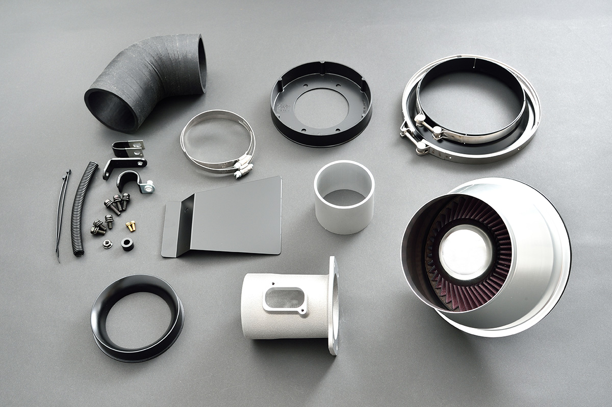 グリル内のエア導入板よりエアインテークに吸入空気を導きK&N製のフィルターにより高効率に吸入してパワーアップを図ります。 またアルミ製のエアファンネルよりエンジンからの遮熱効果により吸入温度を下げます。装着により5PS~10PS程度のパワーアップとなります。